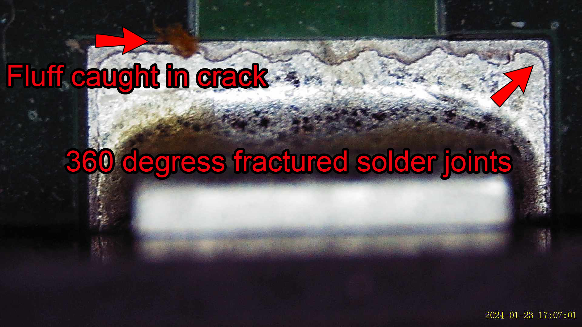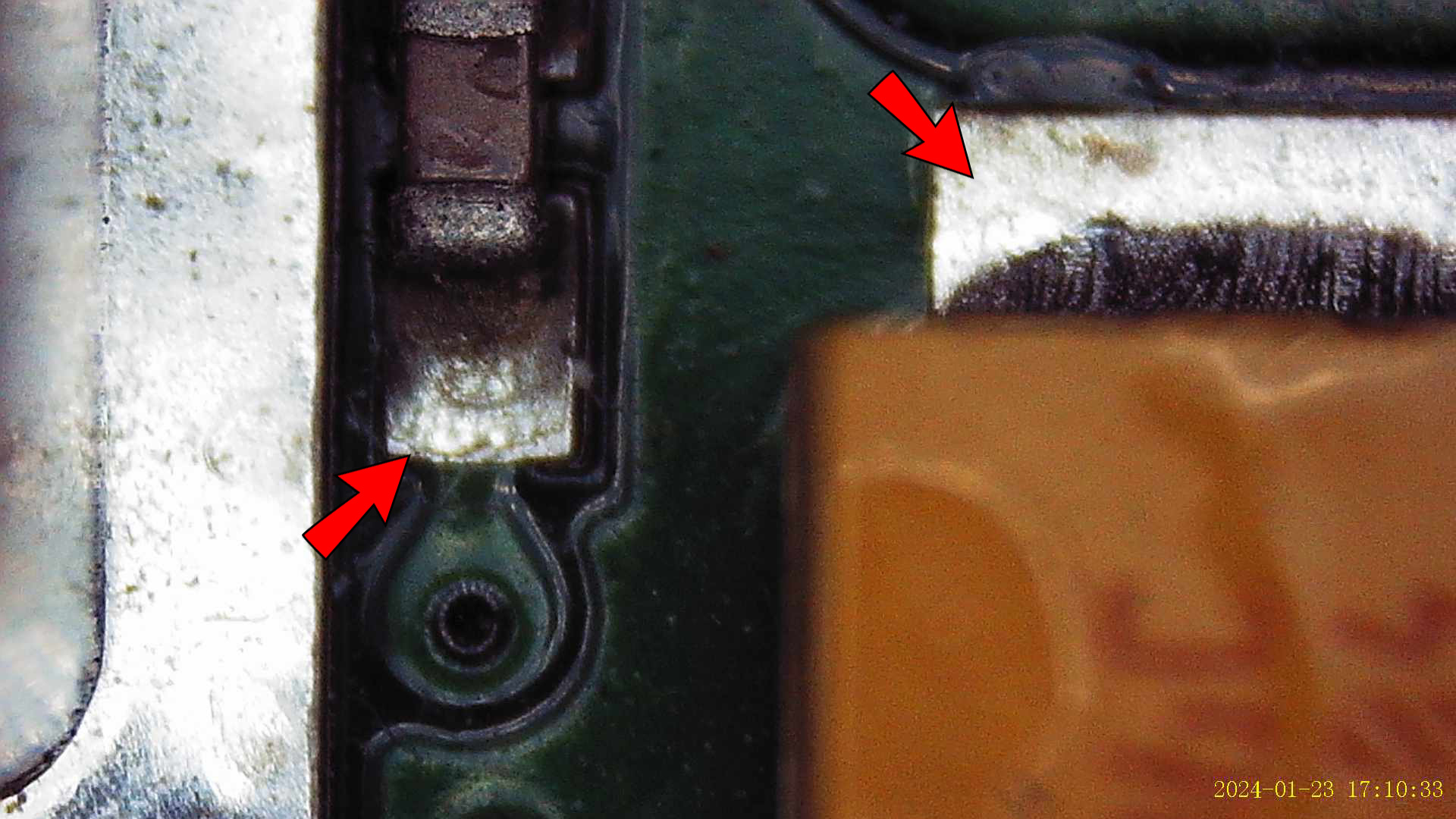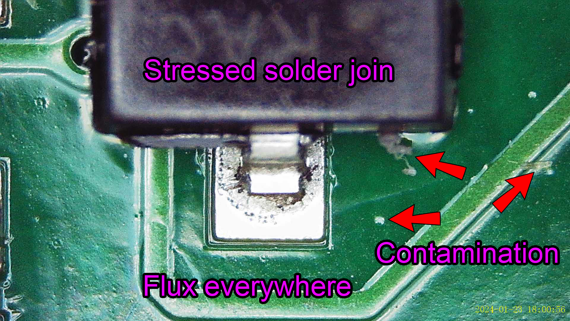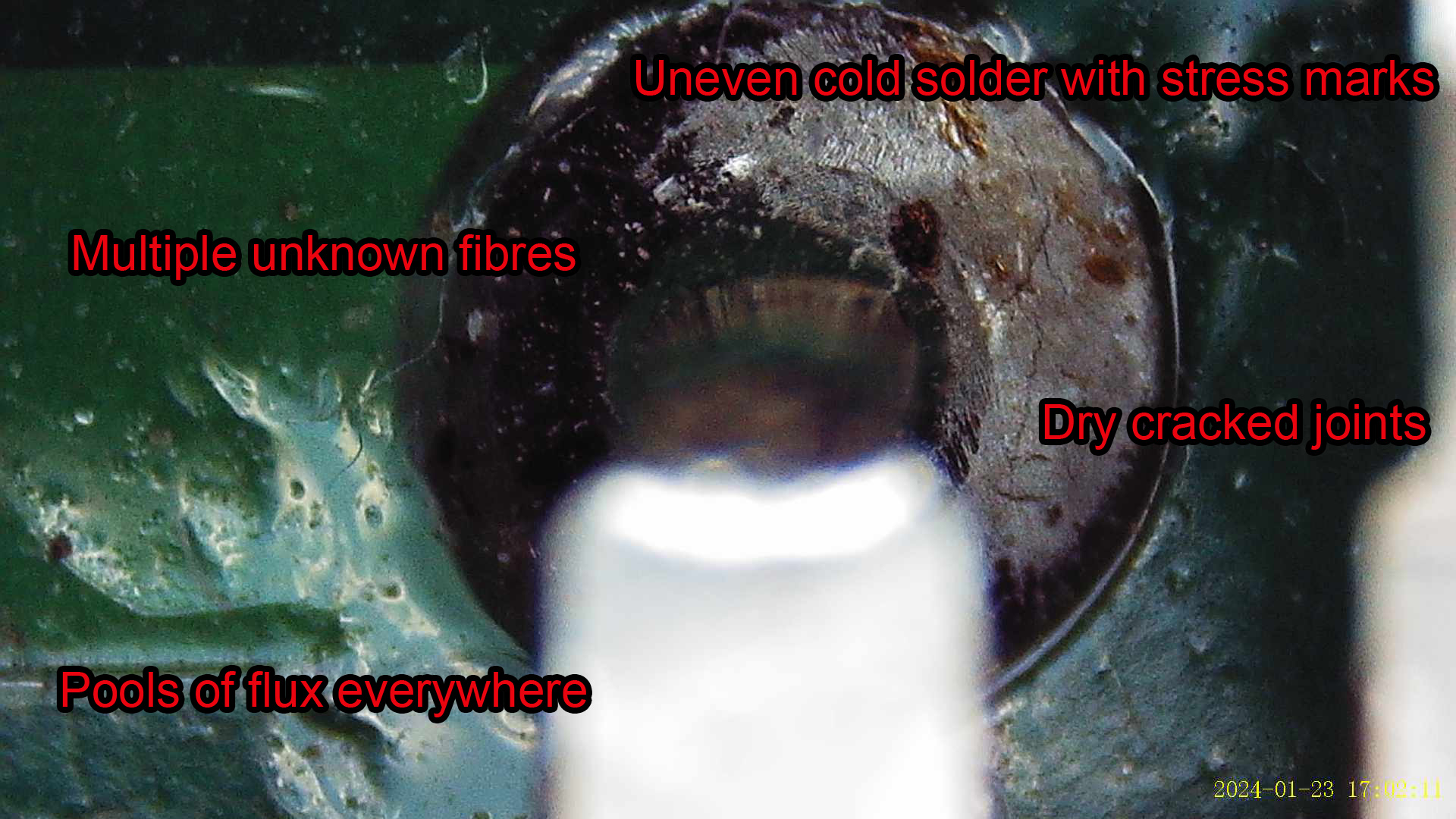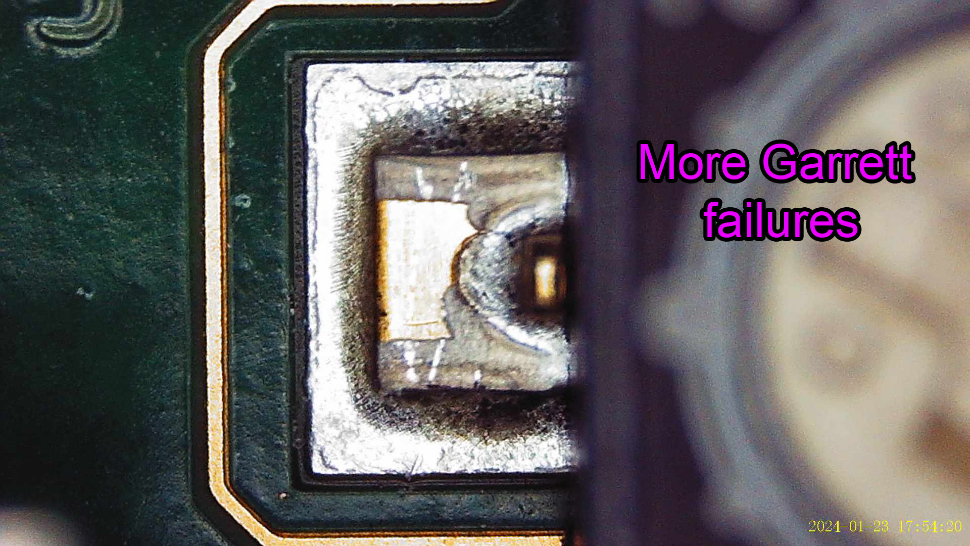 Garrett Australia offered me a second hand/used machine as a replacement under instruction from those above them when I for either a full refund (preferred) or a brand new replacement. I decided to dismantle the machine to check if there was any obvious problems, which led me to the following after noticing a very definite dry solder joint.