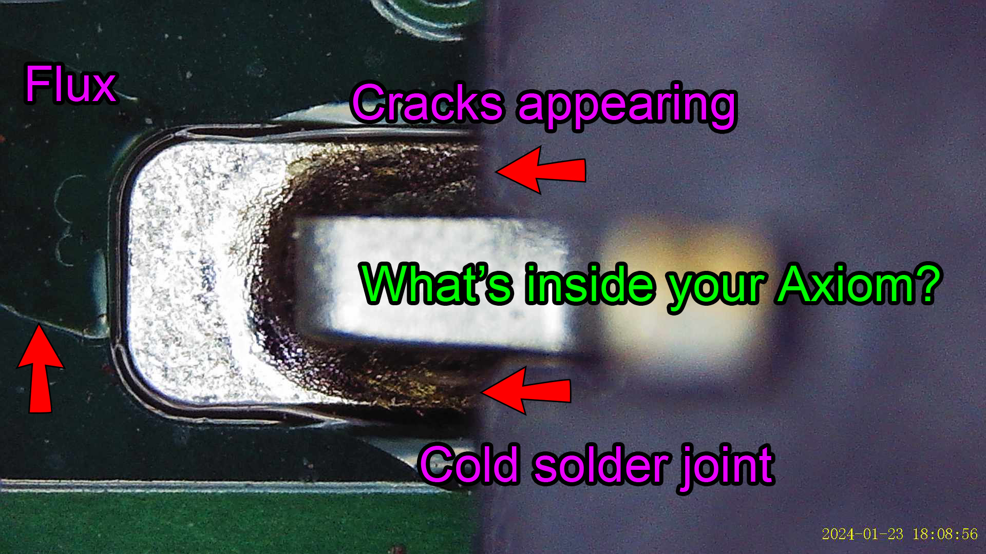 Initially, a faulty “burnt out” component has been found. A multitude of other design issues have been discovered explaining why the Axiom has a number of reported problems. Apparently, it is a non-traditional electrical layout where many considerations have been overlooked, in particular – the power circuit (but there are also other areas).
