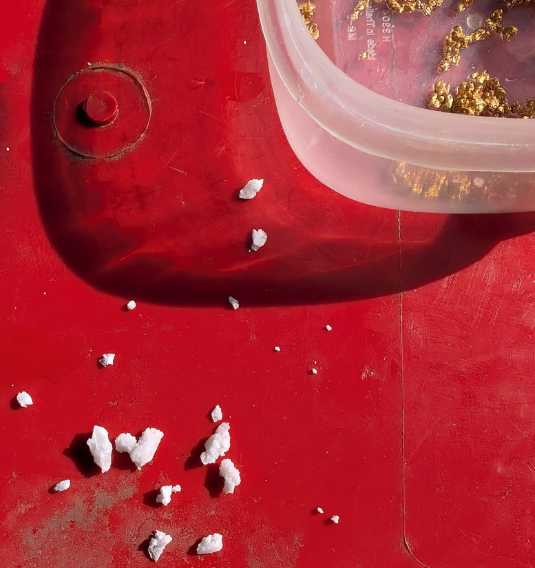 For partial removal of host rock, use a sealed plastic container (vapors alone can kill you!) and partially submerge the gold specimen to reveal a particular section. Or, fully submerge but check daily for progress.